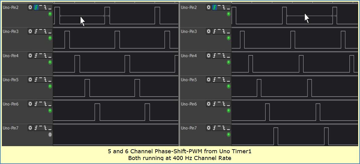 Uno's 16-bit Timer is combined with pulse-generating code to create a 2-thru-6 channel Phase Shift PWM project. Mega, Nano, a 328 PDIP and other MCU's can support this type PSPWM. More recent 32 bit Arduino processors supporting 16-bit Timer Output Compare Interrupts should work with recalculation and appropriate code changes.