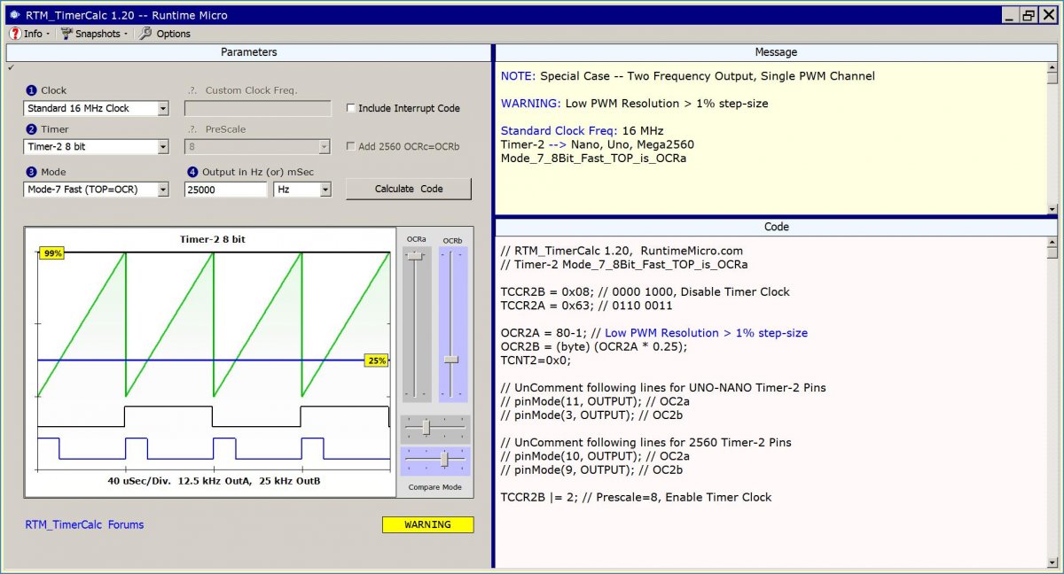 Using selections you make (Clock, Timer and Mode) along with your desired Frequency, the application shows a depiction of your PWM waveforms. Those same waveforms will appear on an oscilloscope hooked to your ARduino MCU port pins (after you upload the code of course).