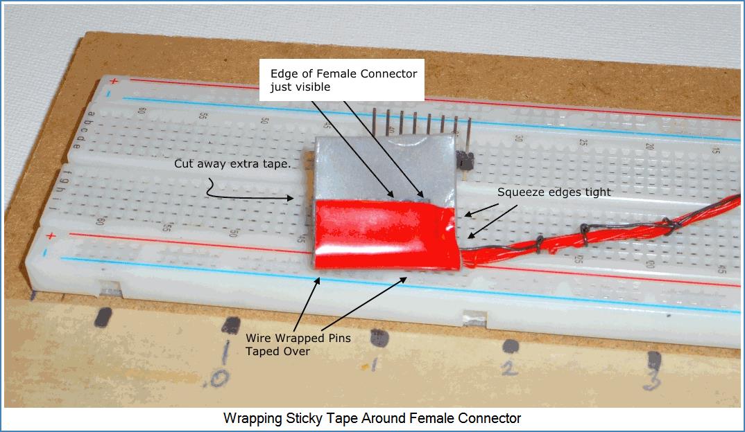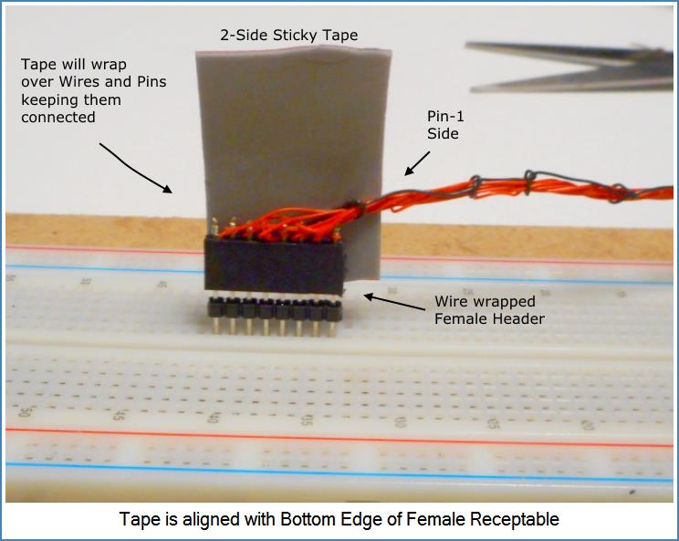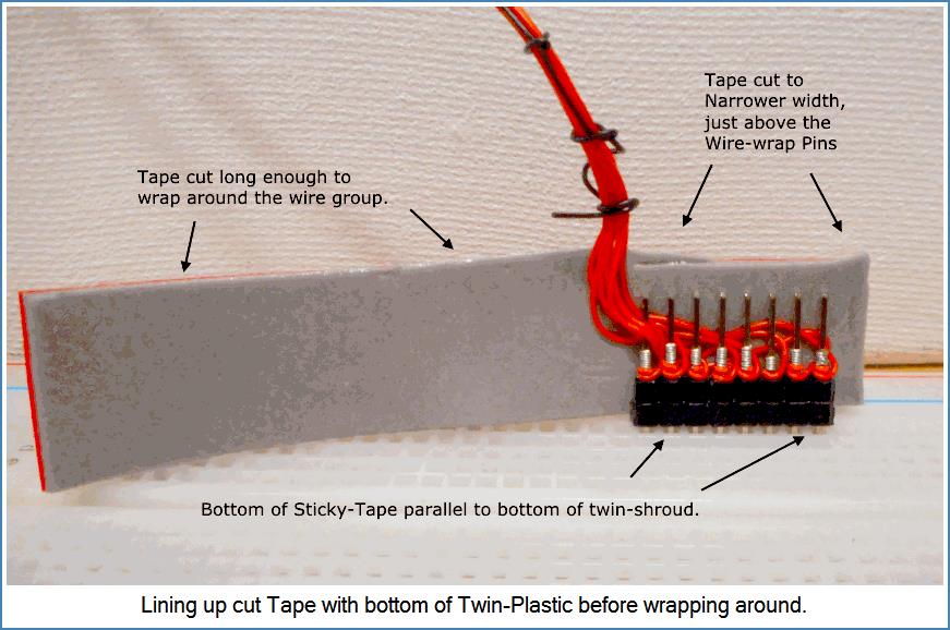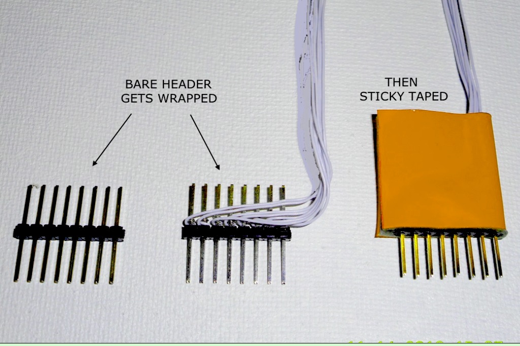 As shown in the next image, a wired header strip is ready to be covered with 2-side sticky tape. I usually cut tape to twice the header length plus a little more. This ensures I can wrap the tape around the wire-side of the pins. NOTE! Its important to ensure your sticky tape covers the plastic shroud strips at bottom.