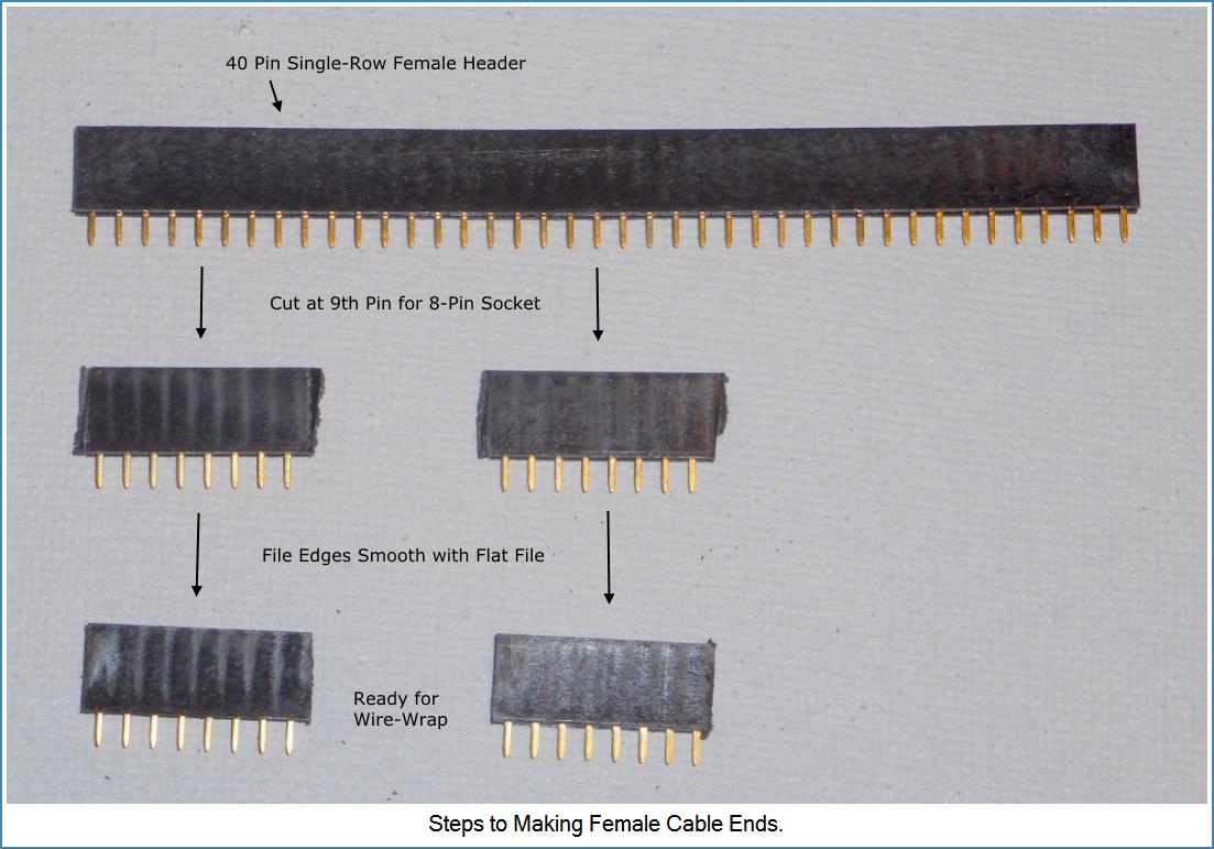 40-pin Female Header strips can be obtained online for low cost. I buy them in lots of 10 or more. Once I decide on a particular cable size (number of wires), I cut the header strip with rugged dyke cutters. I count the number of pins I want plus one. I cut on the plus-one pin, breaking it apart. The metal inside is freed and must be discarded to avoid any accidents! Rough cut edges are filed smooth with a standard flat file. In this example, we'll make two 8-pin female plug-ends. (See next Image).