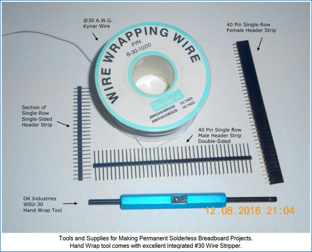 You'll need a hand-wrap tool and some #30 AWG Kynar wire. You also need Double-Sided male Headers (or female Headers for Cables with female plug-ends). All these items are available online. Shop around and you'll find what is shown in the next Image.