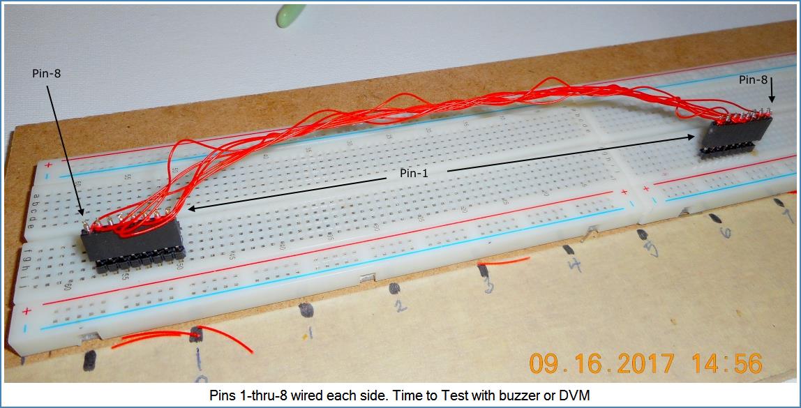 With both connectors taped, we can make a quick double check by again buzzing connections. The supporting Male headers on the bench do expose a small amount of pin per wire. If that doesn't appeal to you, you can place single-sided headers in parallel to the double-sided ones.
