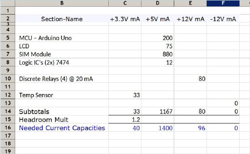 - ON-OFF Sections: With items that consume Current at varying intervals, assume an always-ON situation. This ensures your PSU can accommodate needed Current when the ON time comes. Use this approach for currents used by LED's, Relays, Solenoids, Motors, Fans, buzzers, etc.