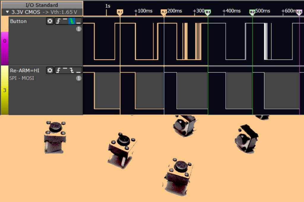 - The lower trace reveals -separation- between button-cycles with no false signals.