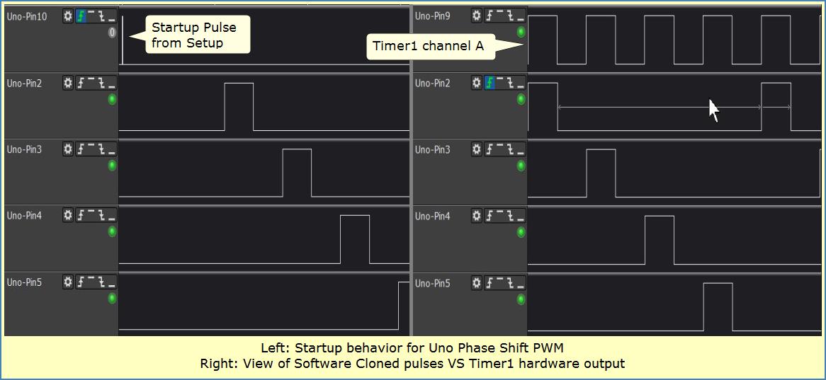 The project employs Hardware-Assisted-Code to generate a variety of Phase Shift PWM outputs. But there's a catch -- output duty cycle is limited to pulse widths with no overlap. Duty is also limited to around 1-2% as a minimum. Plus other Interrupts (like Timer0) can cause pulse width variations.