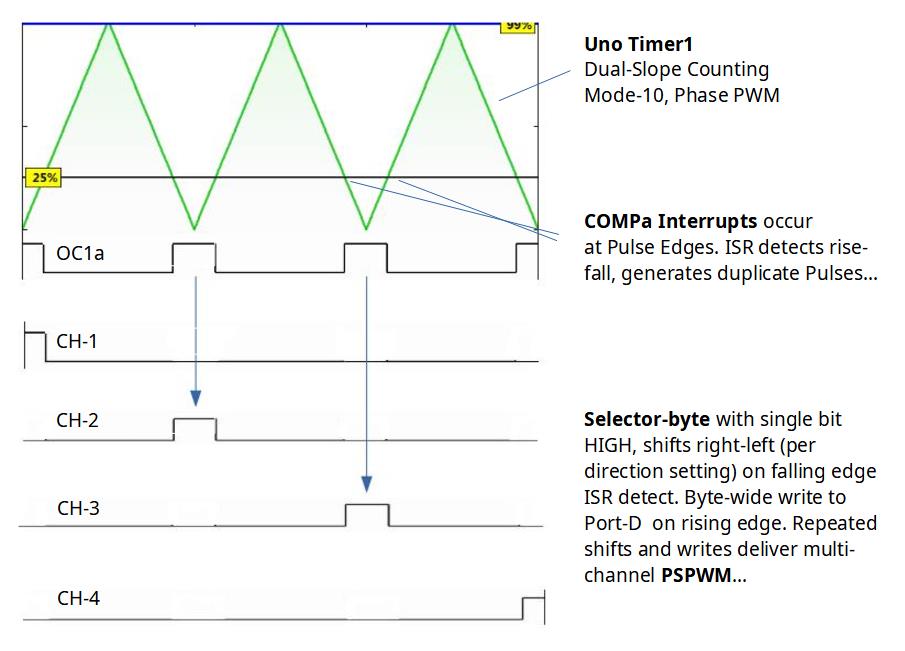 Uno's Timer1 waveform generator outputs stable PWM signals. We can use its COMPa pulse-edge interrupts to make duplicate PWM pulses. The duplicates are slightly delayed but easy to output to Port-D via a selector-byte write. (see next diagram)