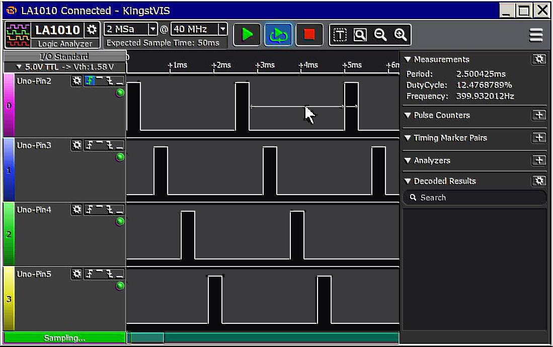 The sketch fires a setup marker-pulse to capture start-up behavior. It also enables an overflow interrupt to provide pulse center-markers. Neither of these markers is needed for general operation and can be disabled.