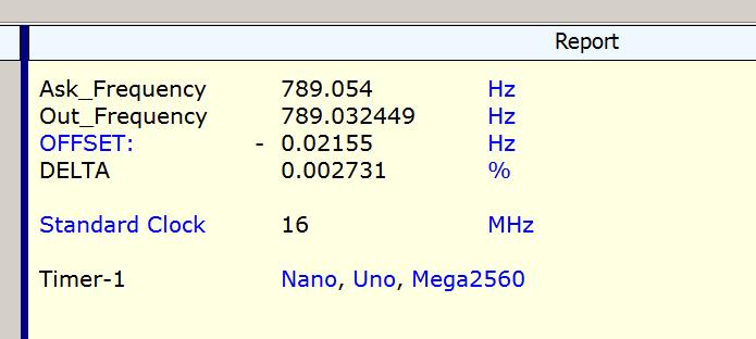 A variation of this report will show when a Limit-Error occurs. You'll be shown the exact problem and supplied with a suggestion to resolve the problem. The Timer hardware has limits it can't exceed. RTM_TimerCalc figures these boundaries and catches inputs that can't work. All Report-Window values are arranged in columns to make viewing easier.