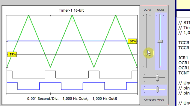 Below these items is the WYSIWYG chart. It contains Slider controls for adjusting Waveform Duty-Cycle and Output-Compare modes.